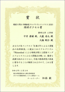 工学部 電気電子工学科4年 中井 康補さん(大橋 剛介研究室)、工学専攻電気電子工学コース 修士2年 大薮 達也さん(同研究室)、工学領域電気電子工学系列 大橋 剛介教授が外観検査アルゴリズムコンテスト2020(主催:精密工学会画像応用技術専門委員会、共催:国立研究開発法人理化学研究所ボクセル情報処理システム研究チーム)において「理研ボクセル賞」を受賞しました。