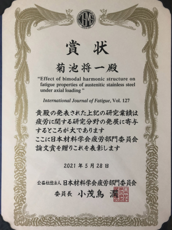 菊池 将一准教授(機械工学系列)が下記研究業績を評価され、2021年5月28日に日本材料学会疲労部門委員会論文賞を受賞しました。