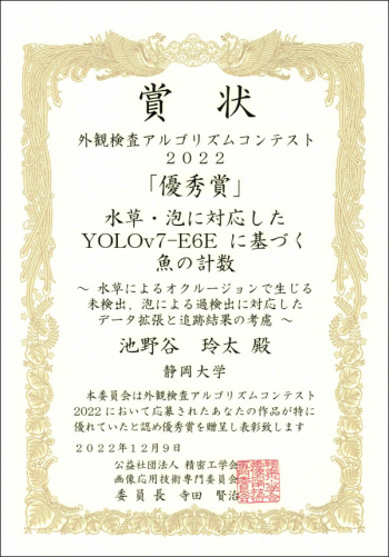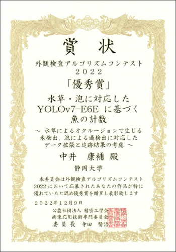 受賞題目:水草・泡に対応したYOLOv7-E6Eに基づく魚の計数 ~水草によるオクルージョンで生じる未検出,泡による過検出に対応したデータ拡張と追跡結果の考慮~