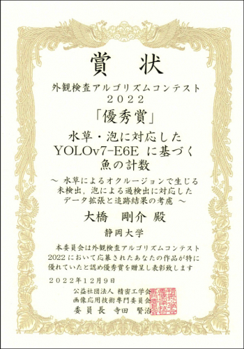 電気電子工学コース 池野谷玲太さん(大橋研究室)、電気電子工学コース 中井康補さん(大橋研究室)、大橋剛介教授(電気電子工学系列)が、2022年12月9日に精密工学会画像応用技術専門委員会主催の外観検査アルゴリズムコンテスト2022にて優秀賞を受賞しました。