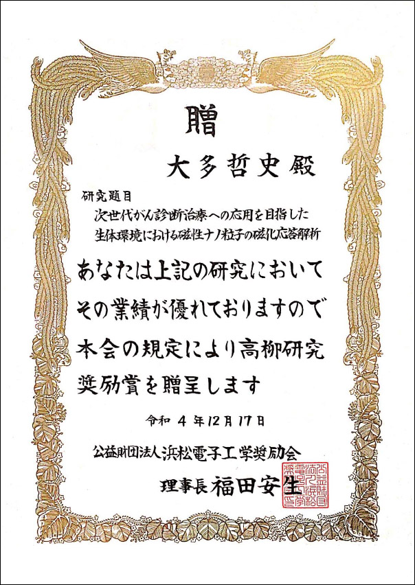 大多哲史 准教授(電気電子工学系列)が公財浜松電子工学奨励会より2022年12月17日に高柳研究奨励賞を受賞しました。