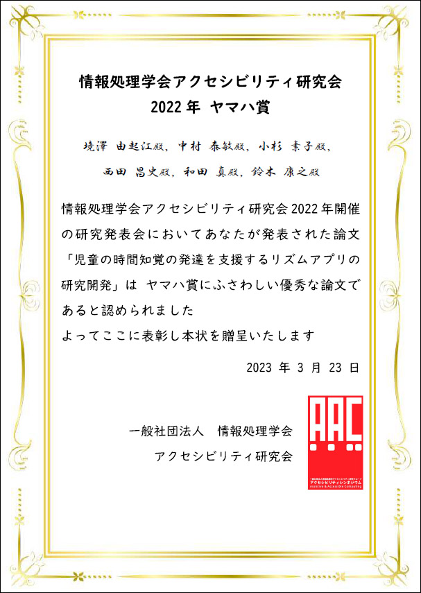 事業開発マネジメントコース 境澤由起江さんと中村泰敏さん(鈴木研究室)他が情報処理学会アクセシビリティ研究会2022年ヤマハ賞を受賞しました