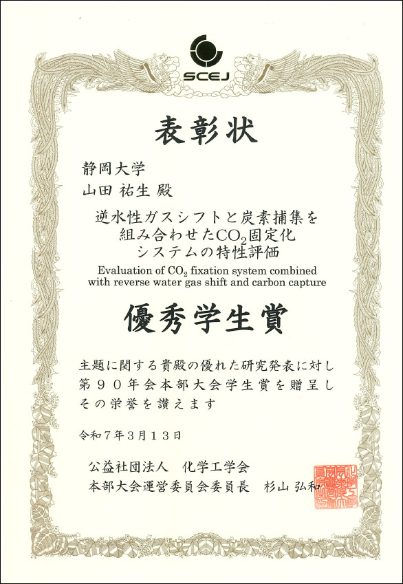 山田 祐生さん(工学専攻 化学バイオ工学系列/福原・渡部研究室)が化学工学会 第90年会 優秀学生賞を受賞しました。