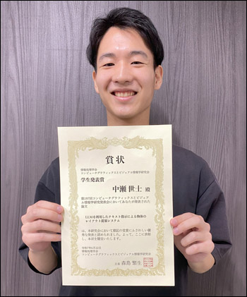 中瀬 世士さん(数理システム工学科/岡部研究室)が、2025/3/5~6に開催された、情報処理学会第197回CGVI研究会において学生発表賞を受賞しました。