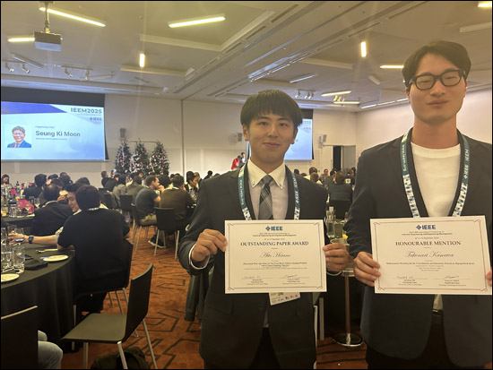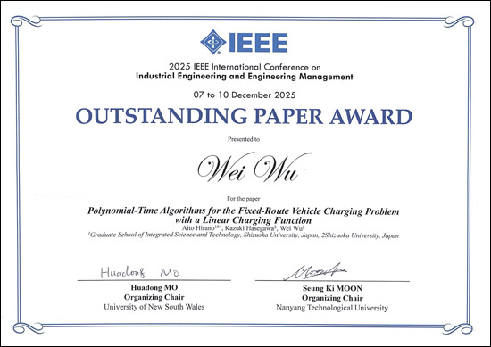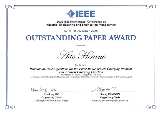 平野 愛翔さん、長谷川 和樹 さん(工学専攻数理システム工学コース/呉研究室)および呉 偉准教授(数理システム工学系列)が、2025/12/7~10までオーストラリアで開催されたThe IEEE International Conference on Industrial Engineering and Engineering Management (IEEM2025)においてOutstanding Paper Awardを受賞しました。