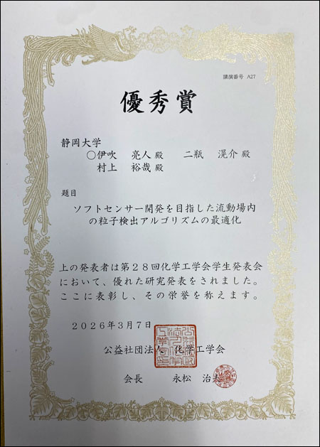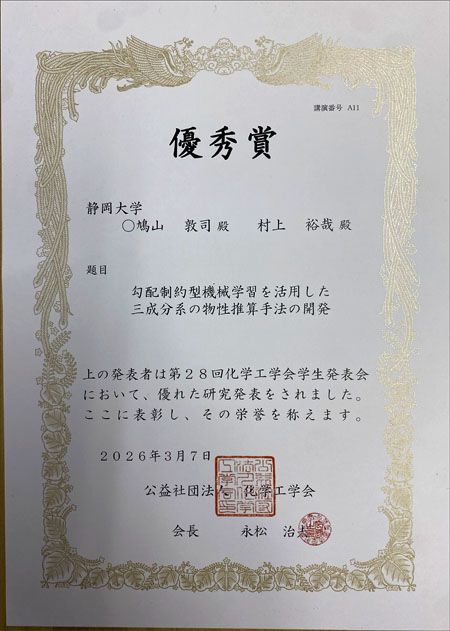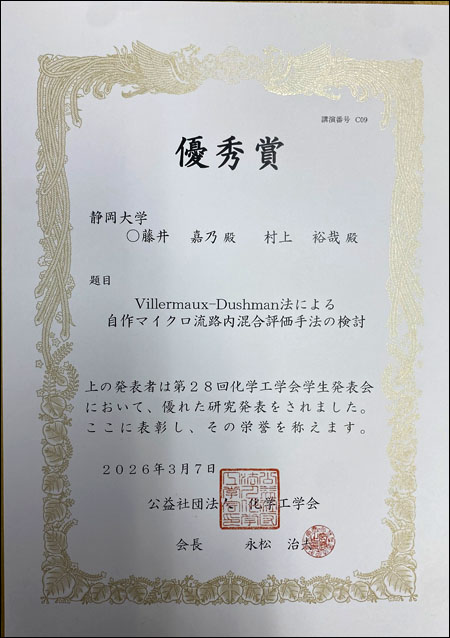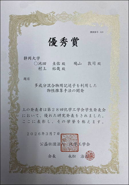 鳩山 敦司さん、池田 圭佑さん、伊吹 亮人さん、藤井 嘉乃さん(工学部化学バイオ工学科/村上研究室)が、2026年3月7日に開催されました第28回化学工学会学生発表会において優秀賞を受賞しました。