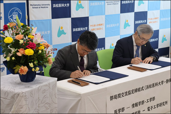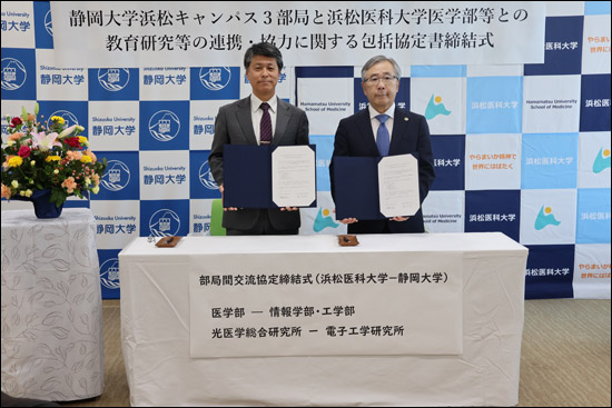 国立大学法人浜松医科大学と国立大学法人静岡大学工学部浜松キャンパスの3部局(工学部、情報学部、電子工学研究所)は、令和7年11月10日(月)に、双方の教育・研究等の機能強化及び事業の発展を目指し、連携・協力するために、それぞれに部局間包括協定を締結いたしました。(工学部、情報学部は浜松医科大学医学部と、電子工学研究所は浜松医科大学光医学総合研究所との協定)